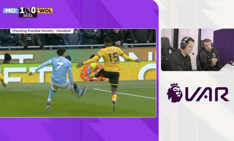 He informed the stadium: “Following the review, the ball makes contact with the Wolves player’s arm, which is positioned naturally, therefore the initial decision stands.”